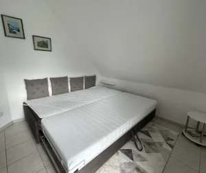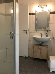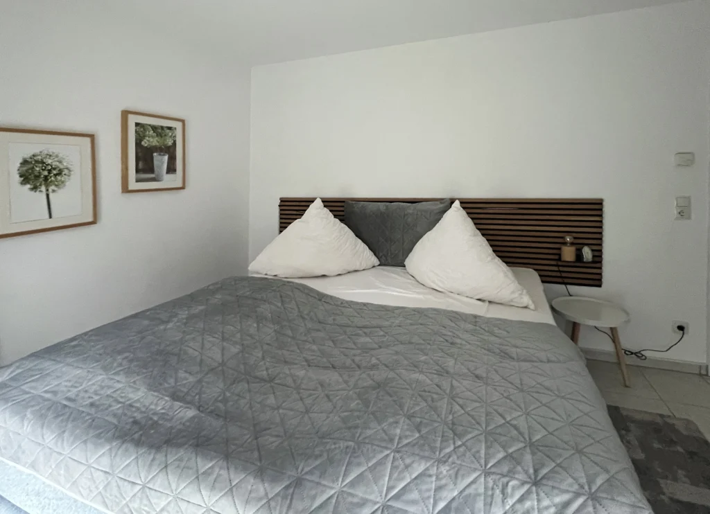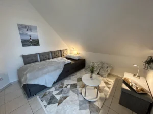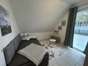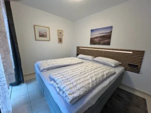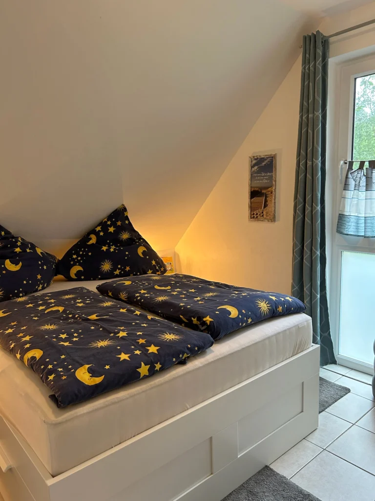 Im Obergeschoss befinden sich das Tageslicht-Bad und zwei Schlafzimmer. Ein Schlafzimmer bietet ein bequemes 1,80 m breites Boxspringbett, das zweite Schlafzimmer enthält in Wohnung Bodden ein ausziehbares, 1,80 m breites Schlafsofa und in Wohnung Meer ein 1,40 m breites Bett.