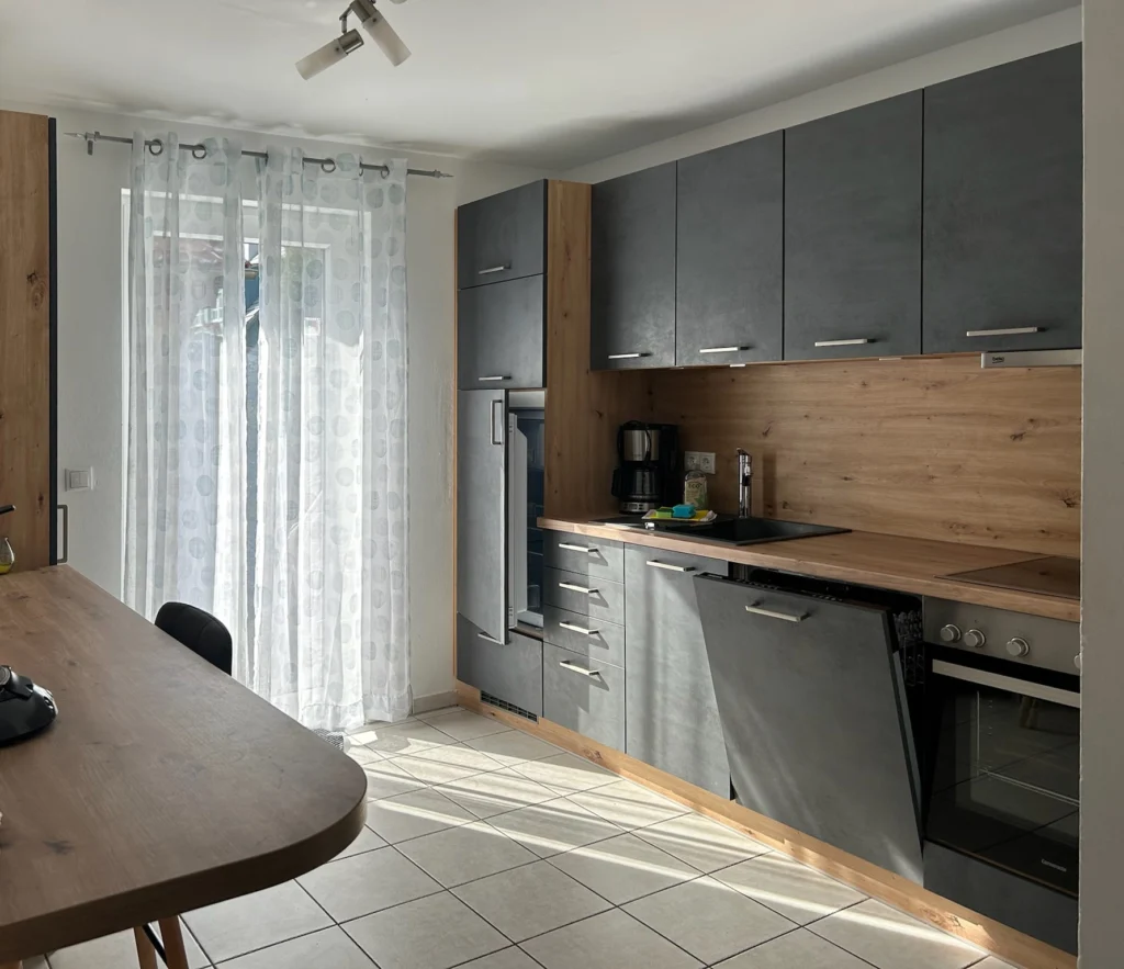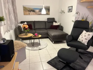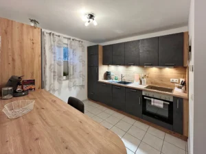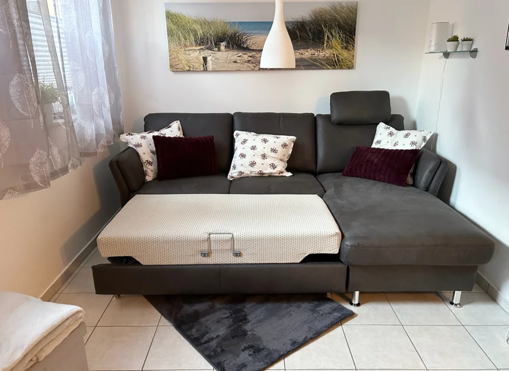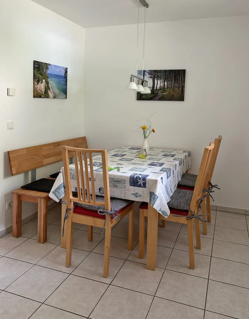 Im Erdgeschoss befindet sich die hochwertig ausgestattete Küche mit einer kleinen Sitzgelegenheit, sowie das Wohn- und Esszimmer. Der Esstisch bietet Platz für fünf Personen, und bei Bedarf ist der Tisch auch ausziehbar. Das gemütliche Sofa lässt sich zu einem Bettsofa umbauen, so dass hier ein zusätzlicher Schlafplatz als Ausweichmöglichkeit zur Verfügung steht.